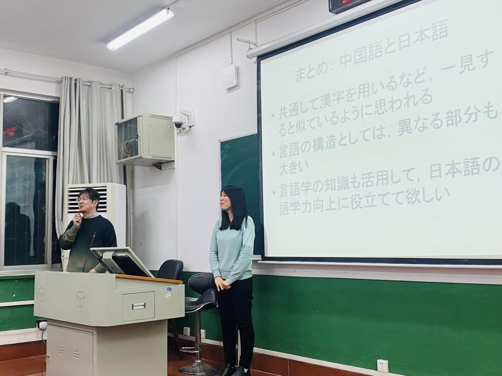 在讲座过程中,江畑教授通过详实举例,风趣、生动而耐人寻味地讲述了语言学基础概念,并结合自己学习汉语的经历,从语音学,形态学,句法学,语义学,语用学各个角度就汉语中相似以及不同的语言现象与日语进行了对比说明。其后,江畑教授还简单介绍了自己目前的研究对象:突厥语系。在讲座的最后,江畑教授建议大家通过活用语言学的基础知识,不断提高日语能力,在学习日语的过程中时常与汉语进行对比思考,寻找研究的乐趣。