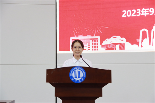 2023级笔译专业田雨作为研究生新生代表发言,她回忆起考研路上的点点滴滴,用自身经历告诉大家:“星子坠深海,跃起是骄阳。”无论风吹雨打,坚持下来,就是更美好的明天。