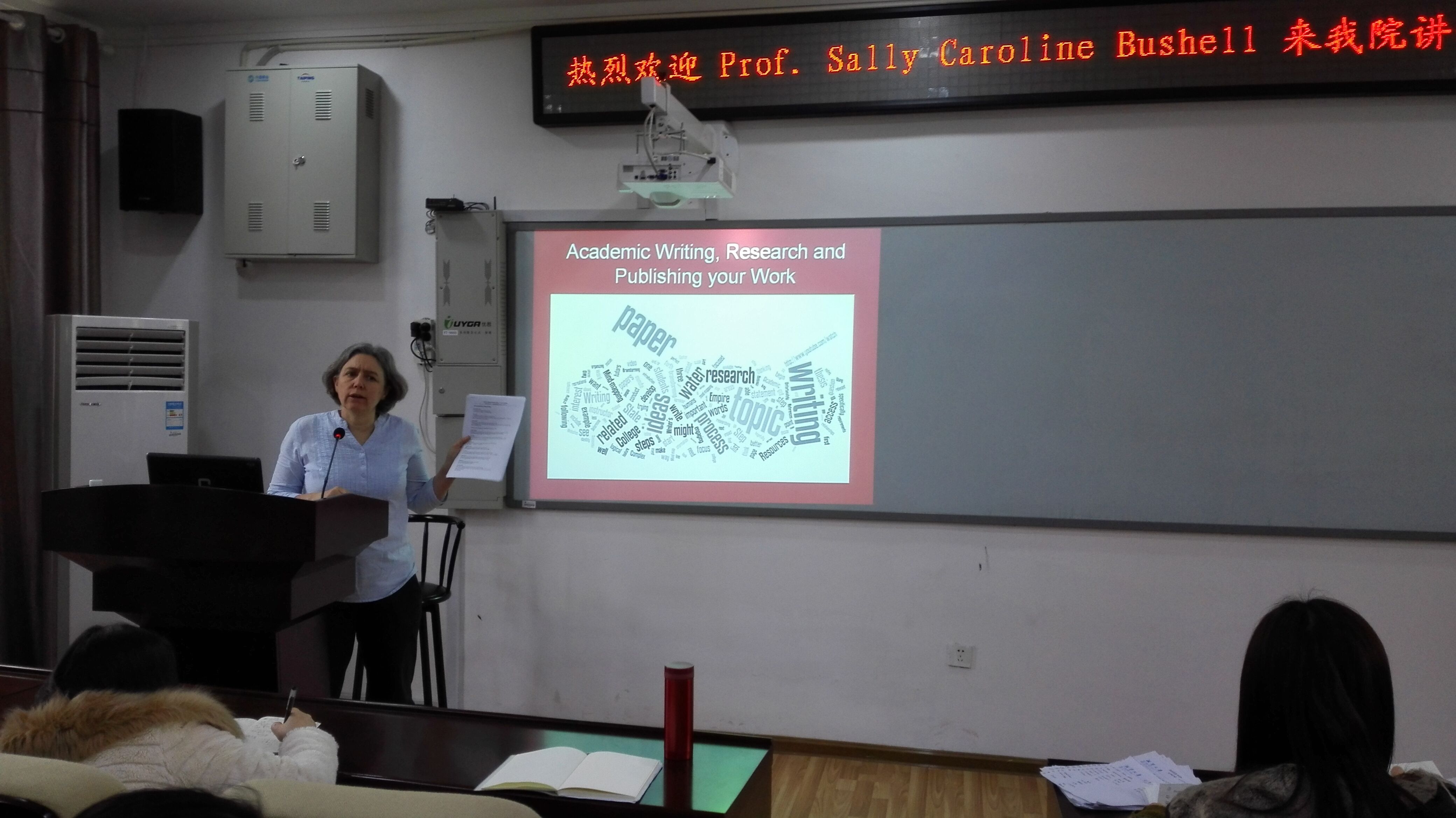 4月10日下午,公司海外名师、英国兰开斯特大学英文与创意系主任Sally Caroline Bushell教授在外语楼305报告厅为学院师生做了第八场题为“Academic Writing, Research and Publishing Your Work”的学术报告。学院副经理熊毅博士主持了报告。报告内容主要涉及学术论文写作、国际学术会议以及论文发表。Bushell教授首先以自己的学术成果为例,详细讲述了如何提出研究问题、如何做科研笔记、如何写论文开头与结尾等关于学术研究与写作的细节问题,并提出了诸多让师生获益匪浅的独到见解与建议。随后Bushell教授主要讲述了如何写会议论文摘要、如何回答专家提问等关于国际学术会议的问题,并鼓励广大研究者特别是青年学者多多参加国际学术会议以开拓视野,了解研究领域的最新发展前沿。最后Bushell教授分享了关于投稿顶级刊物的心得与建议。在互动环节,Sally Bushell回答了同学们提出的“在前人已做了诸多研究的前提下,怎样确定科研方向和选题”、“文学作品、理论书籍、论文等众多科研资源哪一部分应该予以更多关注” 、“怎样运用理论框架”等问题,也针对公司老师提出的“员工在论文写作中对于必须运用前人理论而不能只运用自己的观点感到困惑”提出了自己的见解和分析。现场互动气氛热烈。