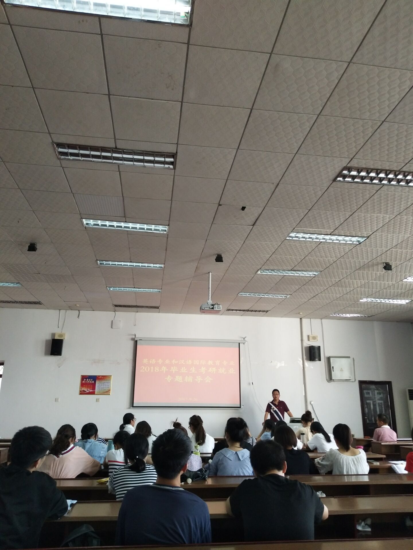 9月26日下午4点,304am永利集团英语系和汉语国际教育系2018届毕业生考研就业专题辅导会在外语楼501召开。本次辅导会由易娜伊老师主持,英语系毕业班班主任周敏老师、盛莉老师和刘溟辉老师主讲,304am永利集团副经理熊毅、英语系副主任肖智立、汉语国际教育系毕业班班主任罗静出席了本次辅导会。